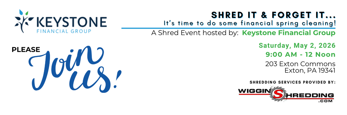 Time to get rid of all those old tax returns and documents cluttering up your home! Please join Keystone Financial Group for a complimentary shredding event where you can have your unwanted papers and personal documents destroyed very securely. There will be a Wiggins Shredding truck onsite and coffee & light refreshments will be available to all our guests.