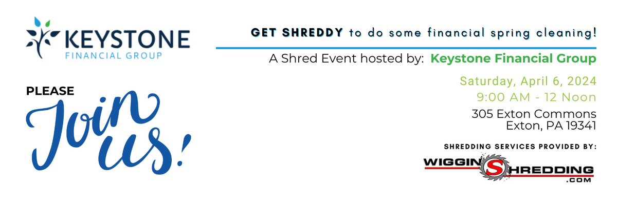 Get shreddy to do some financial spring cleaning! Time to get rid of all those old tax returns and documents cluttering up your home! Please join Keystone Financial Group for a complimentary shredding event where you can have your unwanted papers and personal documents destroyed very securely. There will be a Wiggins Shredding Truck onsite and coffee & light refreshments will be available to all our guests.